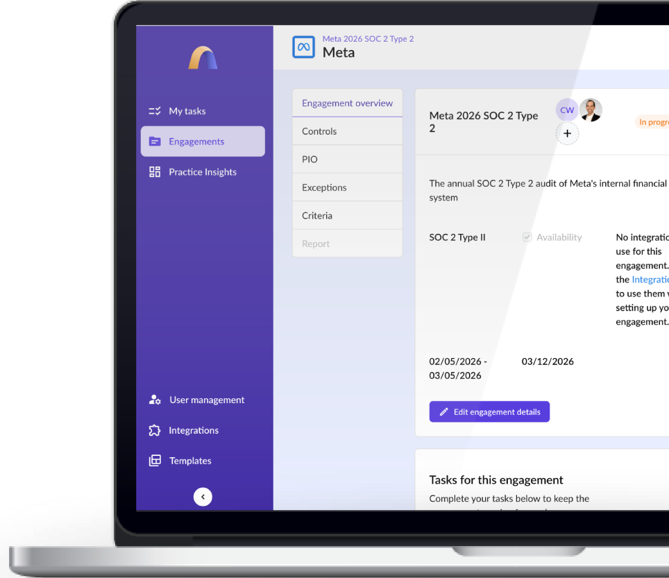 An auditor-built platform to run faster SOC 2 and multi-framework audits: centralized evidence, standardized workflows, automated requests, and consistent reports priced per audit so you scale capacity, not overhead.