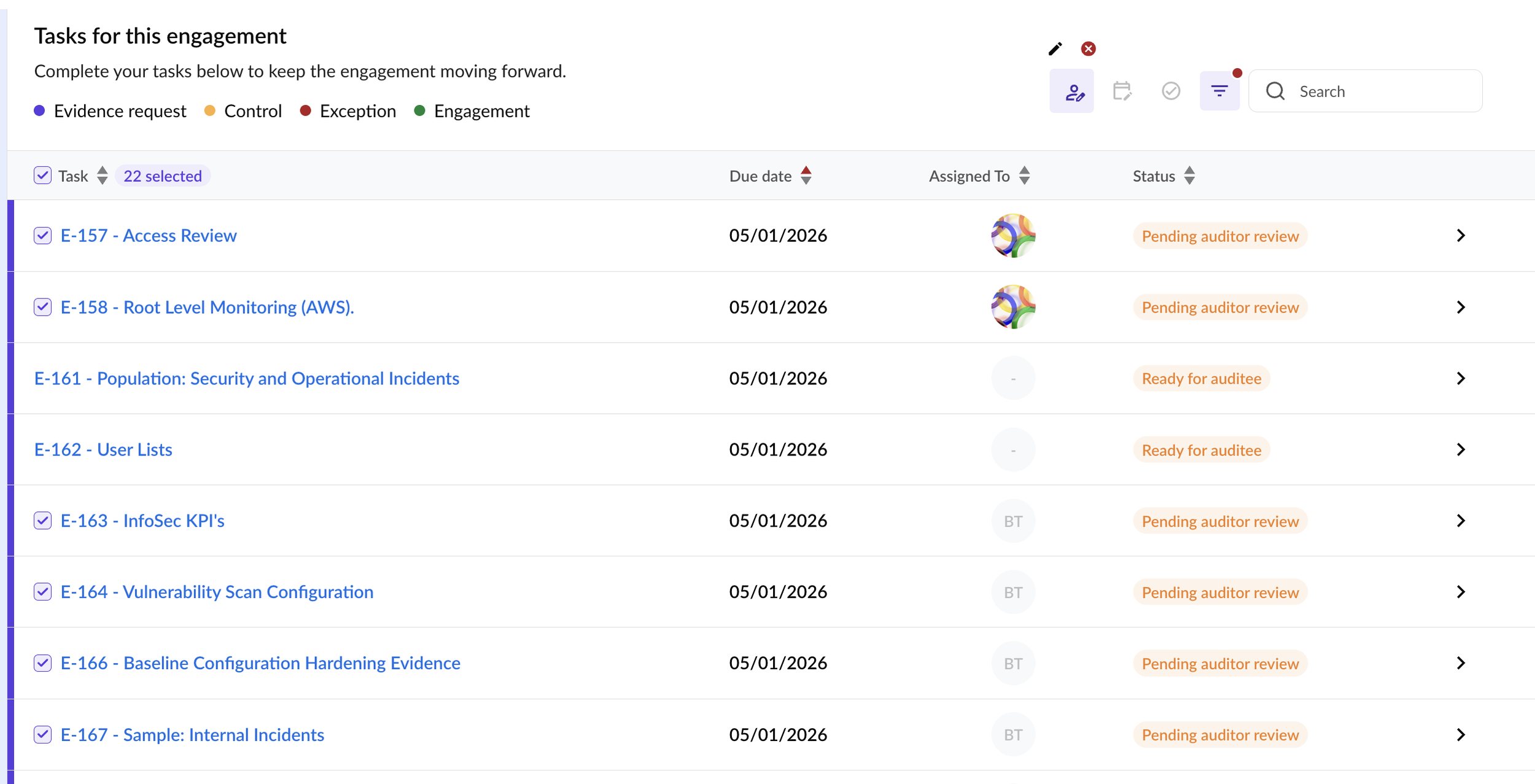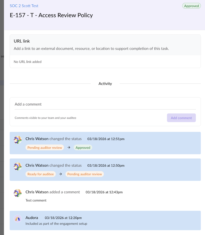 User profile pictures now appear across all tasks throughout Audora so you can see at a glance who owns what, who submitted evidence, and who's involved at each step. We also made improvements to company profile details, giving firms a more complete profile experience and easier access to support when you need it.