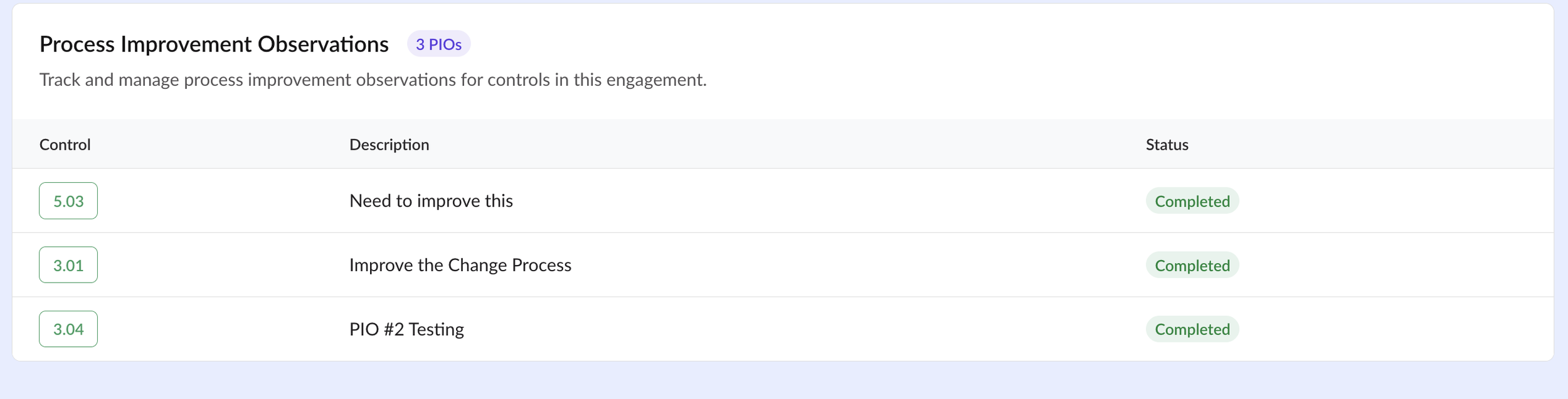 The new PIO section lets auditors document recommendations and improvement insights during the engagement, right alongside the rest of the audit work. No more sticky notes, separate docs, or trying to remember the good stuff at the end.