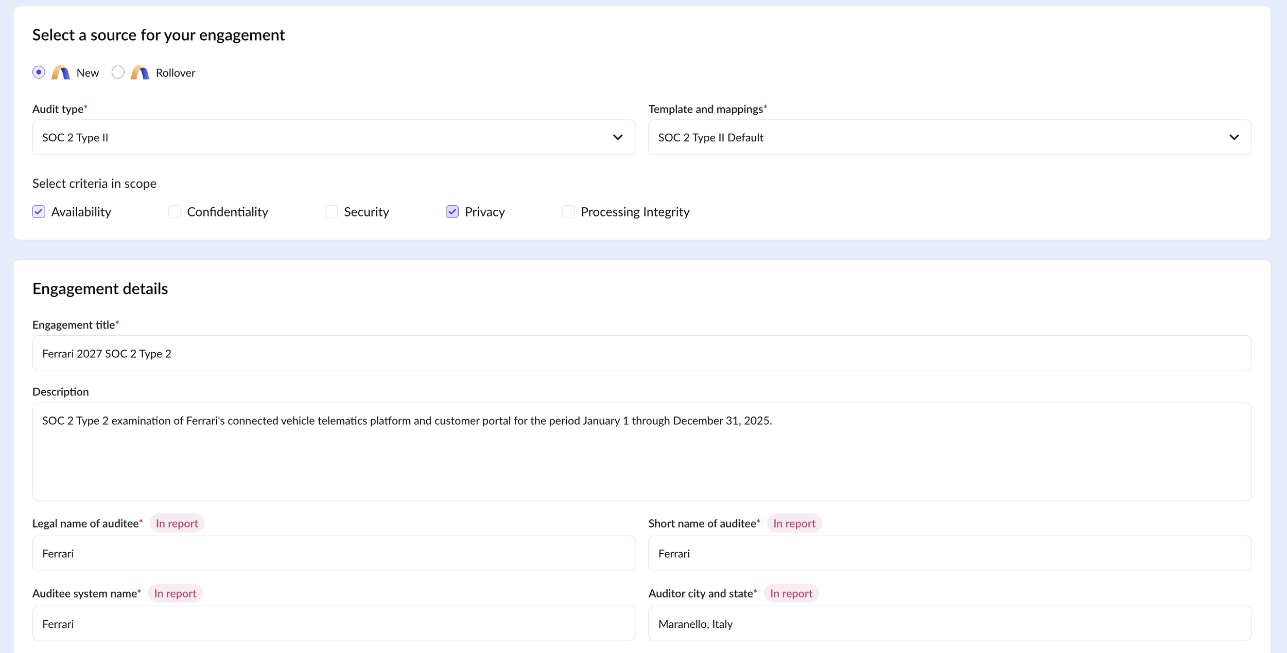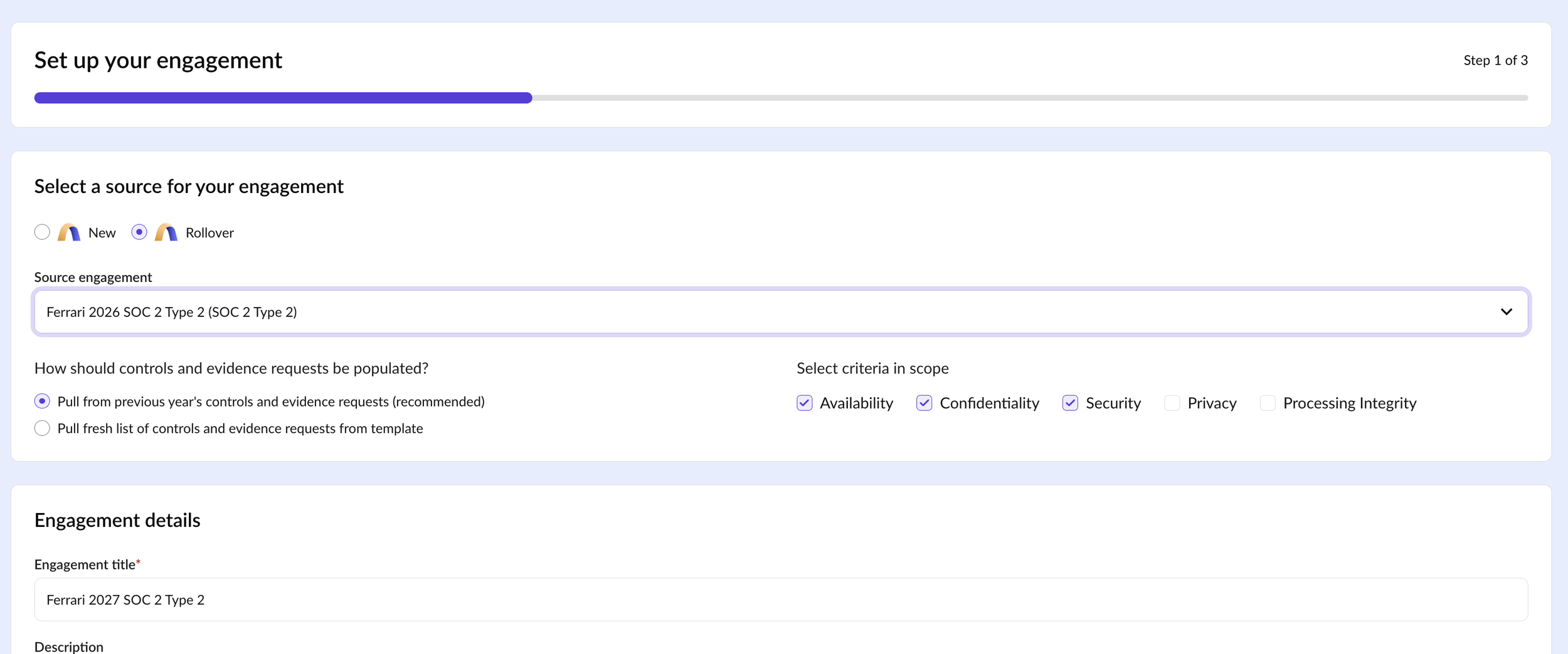 We made major improvements to the engagement creation and setup experience streamlining the flow, making steps clearer, faster, and more guided. Whether you're starting from scratch or rolling over from a prior year, getting started now takes minutes instead of a major time investment.