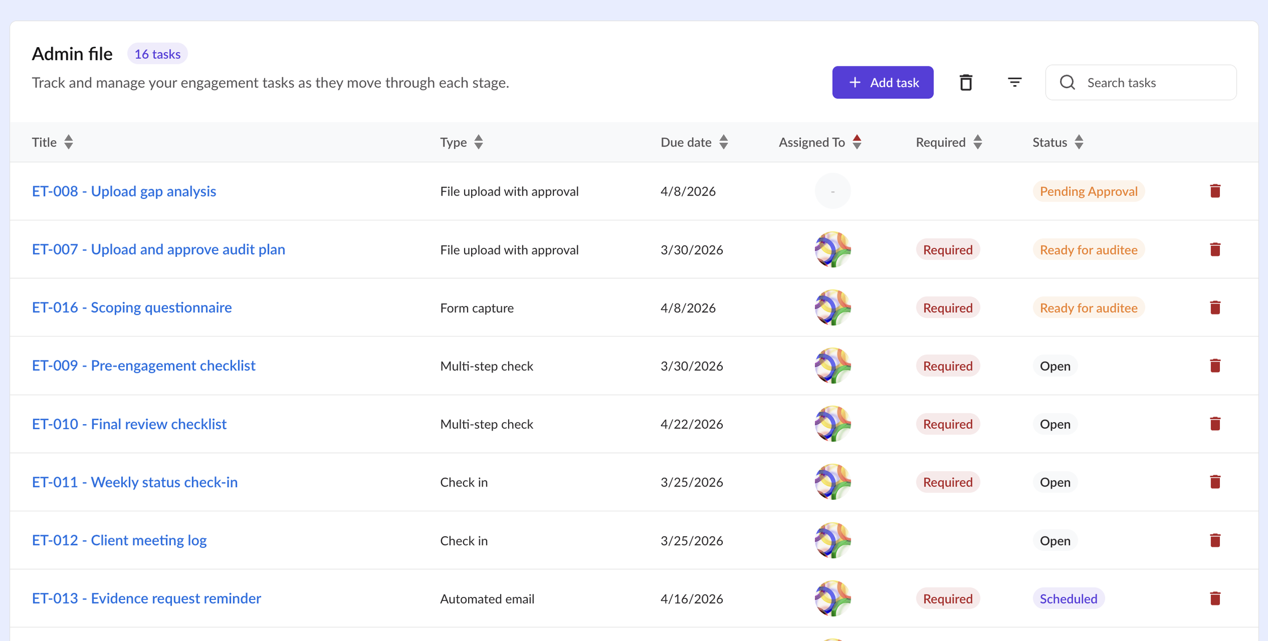 Audits don't slow down because auditors don't know what to do. They slow down because the tools make them do more work than they should, clicking through the same setup screens again, tracking down approvals one at a time, re-entering the same dates from last year, and hunting for status on tasks that should just tell you.