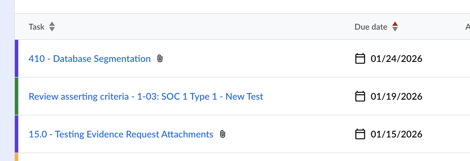 Audora will show a paperclip icon next to the title when a control or evidence request has attachments, so you can instantly see what already has supporting files.