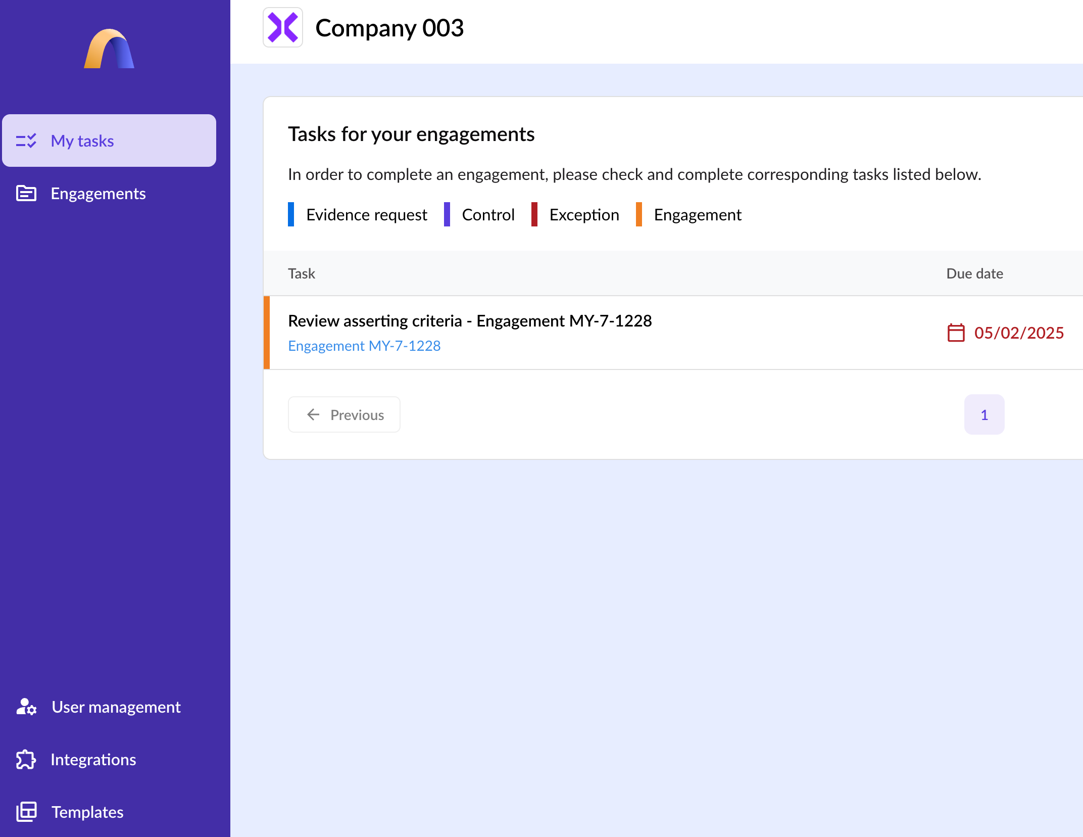 That header at the top? It’s your firm’s name and logo. Inside an engagement, you’ll also see your auditee’s logo and the engagement name, so you always know exactly where you are (and whose SOC 2 you’re living in today).